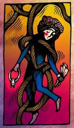 Юноша. Он запутан в веревке. Веревка образует петлю похожую на морской узел. На голове молодого человека венок из цветов. В одной руке он держит ожерелье, в другой листок.