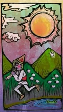 Летний зелёный луг с холмами. По холму ходят овцы. Рядом пастух в белой одежде. Он играет на дудке. Вдалеке на холме артефакт. Внизу озеро, в котором сидит крокодил.
