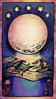 Ночь. Огромная яркая луна освещает море. Над ней светят пять звёзд. Лунный свет проникает в глубины моря. Этого света избегают медузы. На поверхности моря гуляет мягкий ветер. Большая рыба и парусная лодка расходятся в море и устремляются каждый в свою сторону. Словно они были вместе рядом, но затем упал свет луны и развел их по сторонам.