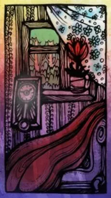 Лето. Пространство – некая комната, ощущение живого пространства. Сквозь закрытое окно проходит ветер, словно оно открыто нараспашку. Ветром колышет легкую голубую занавеску. На окне также стоит красный цветок, словно огонь. Посреди комнаты стоит старое кресло, которое покрыто красной плотной бархатной тканью. Вся комната ощущается неправильной, искаженной. Часы вроде должны висеть где-то высоко на стене, но они находятся очень странно. Это искаженность, несуразность и странность ощущается во всем пространстве комнаты.