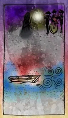 Три музыканта играют мелодию. В их сторону приближается фигура в чёрных одеждах, в капюшоне. В руках она держит очень яркий фонарь. Человек в чёрном и три музыканта находятся на одном из берегов реки. По реке плывет пустая лодка, над которой что-то красное (или свечение, или туман). На пути лодки четыре водоворота. Противоположный берег пуст. Также есть понимание, что человек в чёрном приплыл на лодке с противоположного пустого берега.