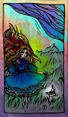 Сверху, паря, приземляется молодая девушка с золотыми волосами. Её словно подхватывают потоки воздуха. В волосах у девушки красная лента. На ней пышное голубое платье с тремя слоями кружев. Девушка плавно приземляется на землю. В землю воткнут серебряный кинжал, который издает белое свечение. Её взор направлен на него. В дали обрыв и море, которое волнуется как кружева.