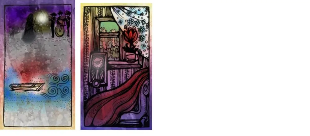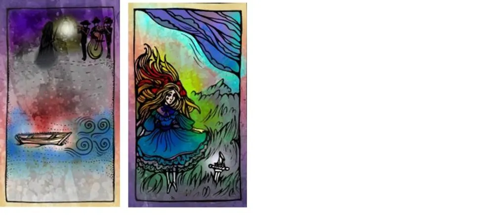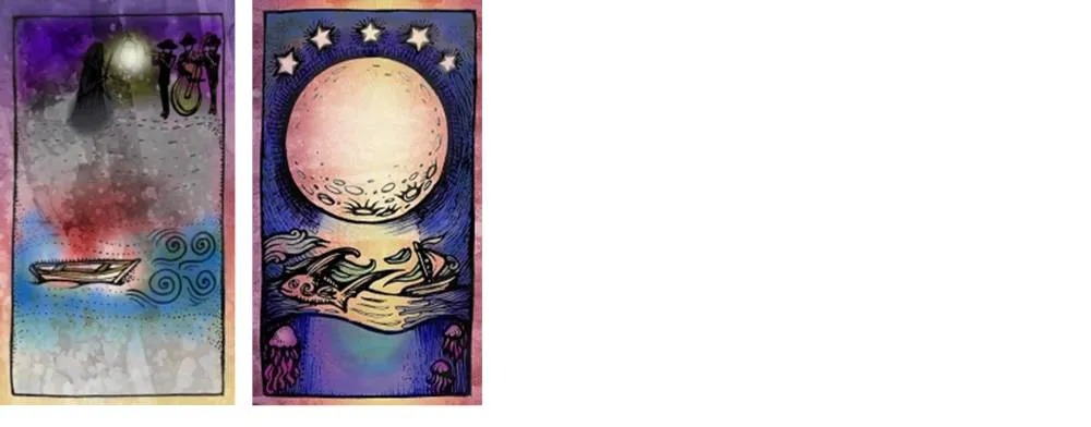 Соотнесите карты Мелодия и Луна. Возьмите Луну из первой карты и поместите её в фонарь путнику. Как измениться путь? Точка «сейчас» – определяет будущее. Чем больше света здесь – тем меньше тьмы где-то там.