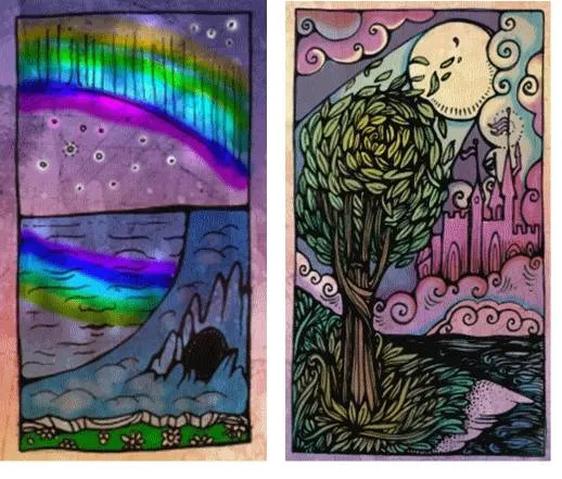 Итак, если вы ознакомлены с практикой карты Сияние, то вы можете вспомнить, что результатом был частично растаявший лед. Теперь возьмем исходные и наложим карточки. Продолжаем работать с нашей рекой. Теперь на нее влияет карта Сияние. Под её действием река словно замерзает. А скорее это можно отнести к перемещению по реке и пространству времени. Насколько замерзло все, насколько остановилось ваше движение? Застыло совсем, либо замедлилось? Эта величина зависит от влияние потаенного в пещере.