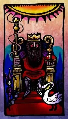 На золотом троне сидит король. У него густая большая борода. Под его одеждой доспехи. На голове корона. В руках держава и скипетр. От скипетра ввысь устремляется закрученный поток. Подле трона белый лебедь, сбоку за троном маленький шут. Над ним светит огромное солнце.