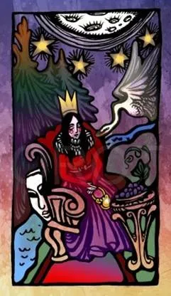 На троне сидит женщина. На голове у неё золотая корона, в руках ожерелье. Перед троном столик с фруктами. За троном прячется маска. Чуть дальше течет река, на берегу которой густой темный лес. Сверху к королеве летит белый лебедь. На небе ярко светит луна и четыре звезды.