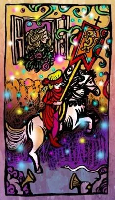 2. Всадник на белом коне в софитах славы и триумфа. Всадник с повязкой на глазах. Он слышит призыв и ликование, но не видит. Вот он входит в город и уверен полностью в себе. Лишь конь замечает змею и встает на дыбы в самый последний момент.