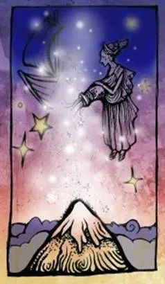 Высоко, в ночном небе, над облаками и вершиной пика горы, сияет млечный путь. Россыпь звезд будто спускается на вершину горы. Около потока звёзд проявляется силуэт женщины(ангела). В руках она держит кувшин, из которого течёт вода и вливается в млечный путь. Сквозь сияние звёзд вдали виднеется силуэт проплывающего корабля.