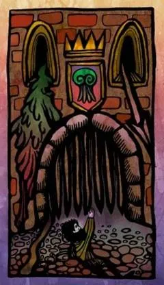 Городские ворота города-крепости. Над воротами висит герб с короной. В стене два маленьких окна. Из одного высунуто копье. В другое окно ползет плющ. Перед воротами лежит человек. Из-под ворот вытекают сточные воды.
