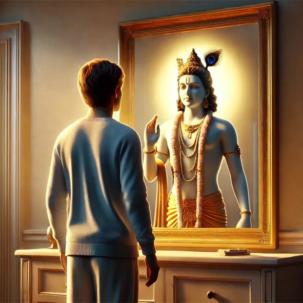 В каждую эпоху – это раз в день Брахмы – Кришна появляется в своем изначальном облике. Иногда мы видим на каких-то картинах четырехрукие формы Бога. Но изначальная форма, как здесь Кришна сам утверждает, – двурукая. Это хорошо коррелирует с Библией, где говорится, что Бог нас создал по образу и подобию Своему.