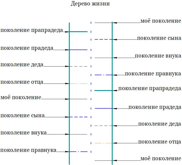 Я тут нарисовала, более понятно. Расположила «хороводы»поколений в одной плоскости, по оси У, которой соответствует наша палочка – это время, у меня время движется вниз. То есть в каждом хороводе, те же представители фамилий, но разных поколений.