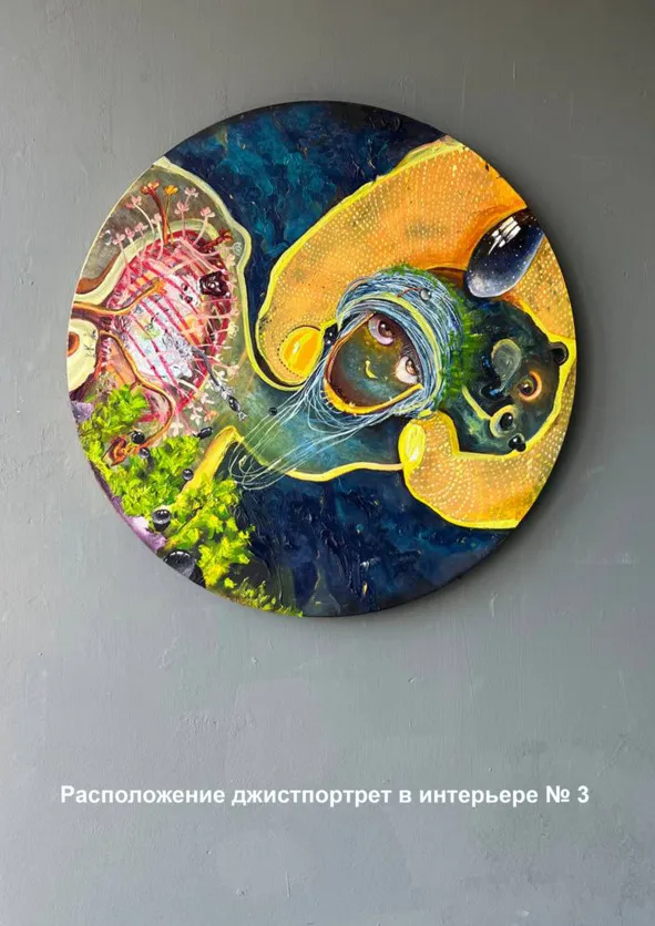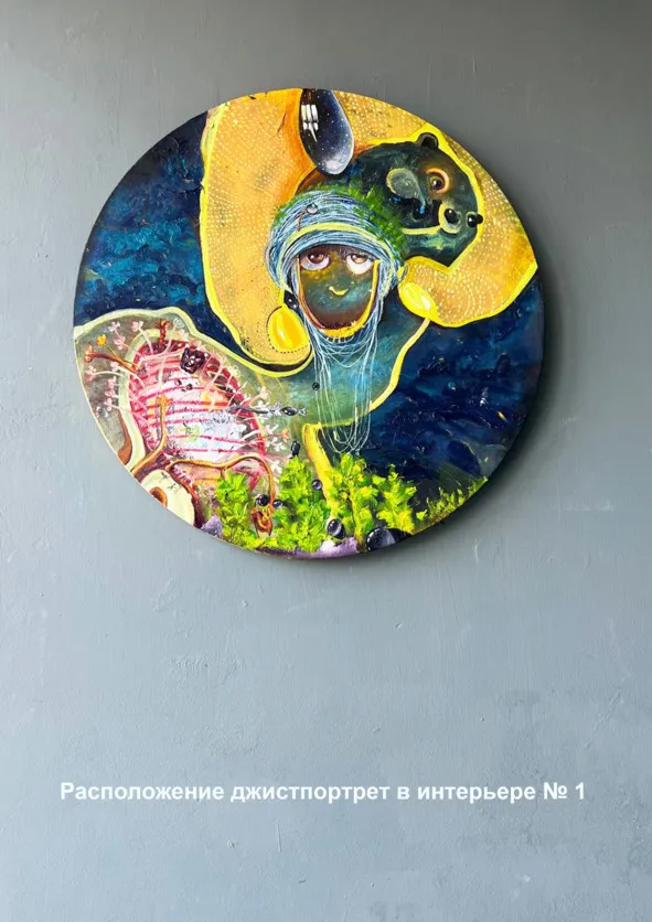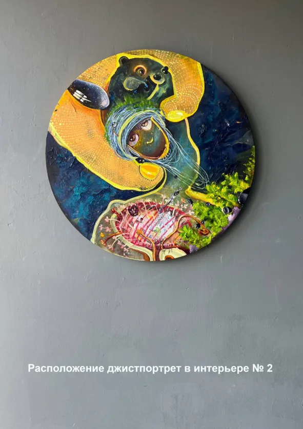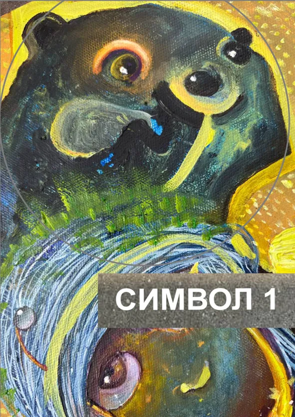 Символ 1 представляет собой цветовое пятно, напоминающее маленького игрушечного медвежонка. Он – весёлый и внешне безобидный, улыбающийся, с сияющими глазами. Под его носом можно увидеть желтую полосу, похожую на трубочку для коктейля. Один край подсоединён ко рту медвежонка, второй – к голове основной центральной фигуры, на которой он сидит. Это расположение говорит о том, что неочевидный страх выпивает наши психоэмоциональные ресурсы. В отличие от страха очевидного, такого, как бегство от разъяренной собаки или страх ремня. Скрытые страхи, которые мы не признаем, имеют разрушающее действие – домысливание негативных сценариев, неуместная подозрительность, навязчивые мрачные мысли. Наше окружение, слыша обрывки наших беспокойных фраз, может обесценивать наши переживания словами: «Да ничего страшного, ерунда». Окружающим кажется, что так они успокоят нас и помогут. Они сами болезненно переносят наши рассказы, и потому желают нас успокоить, чтобы мы не причиняли своими историями и им боли также. И тут медведь выступает как символ задабривания взрослыми маленького ребёнка. Игрушка, как спасение от ночных страхов для маленького ребёнка, оставленного в одиночестве в ночной комнате. Но детские страхи, которые от нас спрятало наше заботливое окружение, сами по себе никуда не уходят. Как медведь-шатун, который вылез из берлоги посреди зимы. Они, подобно этому медведю, шатаются по холмам нашего мозга, ожидая удобного времени для нападения. Татьяна рассказала о любимой кукле, которую ей подарила мама, как об источнике психологической защиты и тёплых ассоциаций с мамой. Но эта линия исследования достойна отдельного описания.
