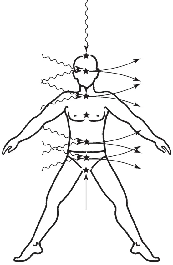 Рис. 11. Крайние чакры могут поглощать только чистую энергию, но через остальные чакры идёт непрекращающийся круговорот потоков, несущих на себе отпечатки человеческих существ.