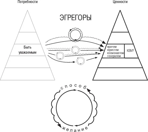 Рис. 24. Перенаправление энергии потребности к архетипу в человеческом сознании – и смысл, и способ существования эгрегора, при котором в коллективном сознании формируется самоподдерживающийся энергоинформационный цикл.