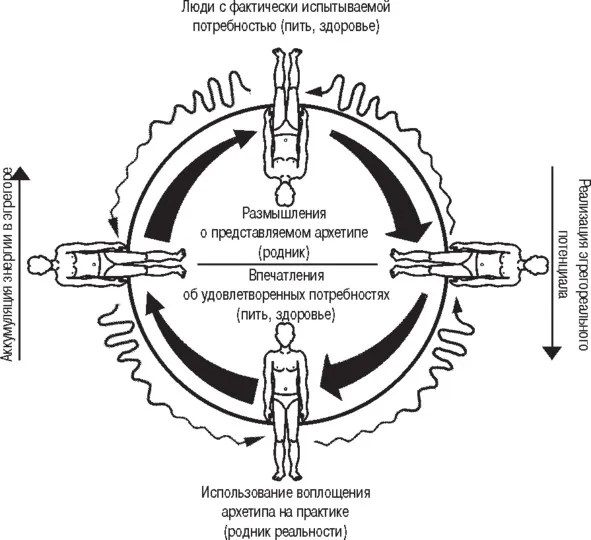 Итак, основой для существования эгрегора является не про- сто потребность, не просто ценность – фундаментом существо- вания эгрегора является эгрегориальный цикл, энергетической основой которого служит энергия центральных потоков, генерирующаяся человеком в процессе удовлетворения потребностей, а регулирующими удовлетворение потребностей элементами – один или несколько связанных архетипических инструментов, факт и способ использования которых человеком и есть суть данного эгрегора. При этом люди с их потребностями и архетипические эгрегориальные инструменты коллективного бессознательного находятся в состоянии психоэнергетического взаимовлияния, сосредотачивая в пространстве между собой огромные количества энергии.