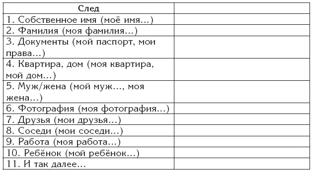 Для данной работы сделайте таблицу, где левую колонку заполните всеми элементами, которые вы можете назвать своими. Из ума или оглядевшись по сторонам; можно открыть записную книжку в телефоне и по ассоциативным связям с персонами, указанными там, составить начальный перечень следов.