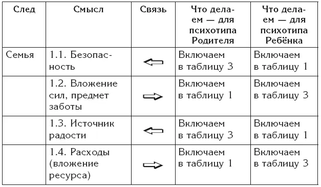 Для примера разберём тот же ключ «семья». Согласно второму методу само понятие «семья» нужно раздробить на множество составляющих факторов: семья – это и родители, и жена/муж, и ребёнок, и дом, и дача, и родственники, и совместные мероприятия, и дела детей, и много-много чего. Следовательно, если это многогранное понятие «семья» разложить на составляющие элементы, сразу станет понятно: какие силу дают, а какие её забирают. В зависимости от вашего природного психотипа и следует разделить их по значимости. Родитель по психотипу увидит нужные для себя связи в тех элементах семьи, которые энергию от него принимают, и поставит их в 1-ю или 2-ю таблицы, а Ребёнок их же – в 3-ю и 4-ю. Напротив, Ребёнок по психотипу в понятии «семья» выделит как значимые те связи, которые позволяют брать энергию, и определит им место в 1-й и 2-й таблице, а Родитель, напротив, эти «вредные» для себя связи должен увести как можно дальше от ядра (с. 85).