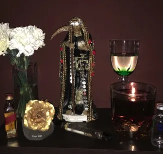 Mezclar todo con una cuchara y lava ahí tu santa. Enciende las velas de tu altar para darle la bienvenida a la santa. También enciende la mezcla de mirra e incienso. Sumerge en el agua a la Santa Muerte, mientras pides que entre en su imagen, y recita: