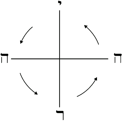 Применяя все это к схеме вращения Кватернера в круге, мы имеем: прохождение первой четверти (1 – Jod), прохождение второй четверти (2 – первое He), прохождение двух последних четвертей (3 – Vau) и познание центра, т. е. понимание определения окружности, без которого нельзя быть уверенным, что четвертый элемент (второе ה) при повороте креста на 90 градусов действительно попадает на место Иода в следующем цикле.