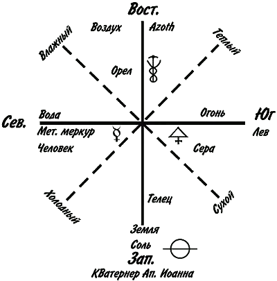 Если Священных Животных распределить так, как мы делали доселе: Орел – Восток – Воздух; Телец – Север – Земля; Человек – Запад – Вода; Лев – Огонь – Юг, то получится зеркальное отображение схемы, данной в первой и десятой главах книги пророка Иезекииля.