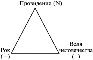 Провидение озаряет своим светом Настоящее; Воля Человечества устремляется на созидание Будущего, но при этом ограничена в своих проявлениях Роком, который гвоздит ее Прошедшим. Если Воля Человечества соединяется, входит в союз с просвещающим влиянием Провидения, то она сильнее Рока: в это время история Человечества носит эволютивный характер.