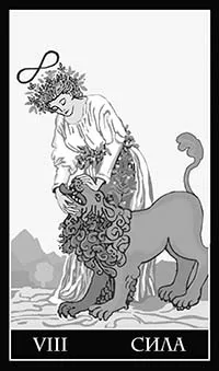 Карте присущ очень тонкий символизм, где лев является символом, прежде всего составной части самого человека. И не борьбу являет нам Аркан, а Божественное таинство слияния. На карте женщина играет со львом, приручает его лаской и любовью. Женское начало оказывается ближе к нашей телесности, к стремлению ко всему, что находится под запретом и под гнетом морали. Женщина глубже чувствует свою сексуальность. Об этом говорит своим потаенным языком цветочная гирлянда, которая означает нетягостное бремя Божественного закона, когда он принимается в самой глубине человеческого сердца. В сущности, перед нами аллегория психоанализа. Углубляясь в недра психики, где заключены модели нашего поведения, мы накрепко обуздываем подсознательные саморазрушительные порывы, способные сломать нам жизнь. Качества, используемые женщиной для укрощения льва, – отнюдь не грубая физическая сила, но сила, проистекающая из источника Божественной любви и духовного разумения, другими словами, перед нами явлены силы души. Душа, психика – вот тот бесконечный процесс, который идет по этой карте. Зачем раскрывать пасть льву, выражать чувства открыто? Именно в чреве льва, в нашем теле, хранятся ключи от нашей энергии, собственных ресурсов.