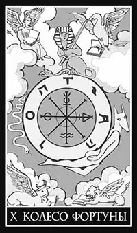 Проявление Провидения в пространственно-временной реальности есть Судьба. Жизнь – это неуправляемая азартная игра, мы целиком зависим от воли слепого случая, нашими судьбами управляет Фортуна. Но не будем забывать о предыдущем Аркане Отшельника. Завеса над движущими силами Космоса приоткрывается перед Посвященным в награду за перенесенные тяготы и труды. К вершинам духовности Отшельника привел не случай, не удача, а разум, прошедший очищение. Если человек чувствует руку Провидения, то эта рука бережно проведет его по жизни, он поймет свое предназначение, узнает, что такое счастье. А вот к человеку нечуткому, бездумно относящемуся ко всему, судьба оборачивается бесстрастной фортуной с завязанными глазами, которая бездушно вращает колесо жизни, превращая его жизнь в череду удач и неудач, взлетов и падений. Если человек сопротивляется судьбе, старается поступить наперекор, судьба превращается в неумолимый рок, ведет человека по жизни против его воли. Судьбы ведут того, кто хочет, и тащат того, кто не хочет. Обычный человек находится в погоне за материальными ценностями, социальным успехом, обладанием людьми и вещами, поэтому жизнь его похожа на бег с препятствиями, неудовлетворенность постоянна, а счастье быстротечно, приходит вместе с очередным приобретением или достижением власти, славы, богатства. Но все быстро приедается. Человеку нужно все больше и больше. И он бежит по замкнутому кругу Колеса Фортуны, увлекаемый его движением и раскручивающий его собой. Это символ еще и человеческого заблуждения, символ неосуществимой задачи – желания всегда быть наверху. Ведь успех или слава неизменно подразумевают свою противоположность. Прибавление в одной области жизни одновременно приводит к уменьшению и деградации в другой. Чем ты готов заплатить за успех? Если много работаешь – мало отдыхаешь. За каждую частицу свободы приходится платить ограничениями в чем-то ином, власть над одними невозможна без унижения других, богатства не бывает без зависимости от денег. Настоящее же счастье выпадает ни за что ни про что, даром. Нет предела совершенству, побеждает тот, кто умеет проигрывать. Стремление к успеху – вполне понятное желание, но ложная цель. Счастье, успех и славу можно удержать у себя надолго, если они не есть самоцель, а являются чем-то сопутствующим. Не главным. Поэтому по-настоящему талантливый человек скромен, мудрец не бравирует своим умом, а одаренный руководитель всегда готов опуститься до нужд простых людей.