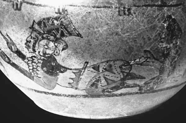 Процедура пейотовой клизмы, майанская ваза, Гватемала, классический период майя, 600 год н. э., AD 600 (вверху); пейотовая клизма, древняя терракота майя (внизу).