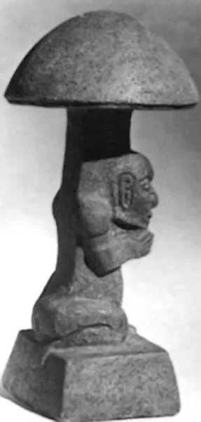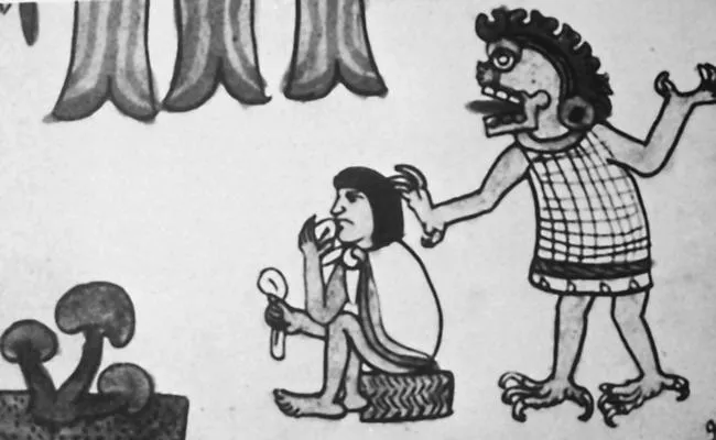 Psilocybe Mexicana (или Psilocybe aztecorum), «волшебный» гриб Масатеков (слева вверху); каменный гриб, Гватемала, ок. 2000 лет назад (справа вверху); принимающий психоактивный гриб и бог смерти Владыка Миктлана. Деталь страницы Ацтекского кодекса, период непосредственно после Испанского завоевания. Кодекс Мальябеки, Мексика (внизу).