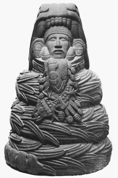 Кетцалькоатль, бог смерти и возрождения доиспанского периода, Пернатый Змей. Кетцаль – разноцветная разновидность попугая – редставляет духовный элемент в человеке, и Коатль – змей – представляет земную природу. Ацтеки, XIV в.