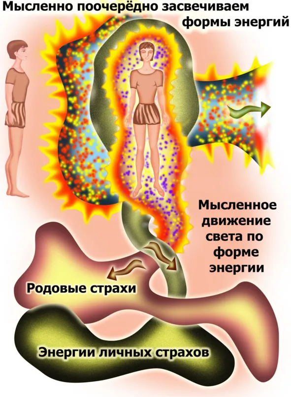 После того, как у нас возникло желание переключиться на работу с канальными личными страхами, мы просто снимаем своё внимание с предыдущей картинки и создаём на человеке, или его образе, другую, похожую форму. Далее, как и в предыдущем случае, произносим: