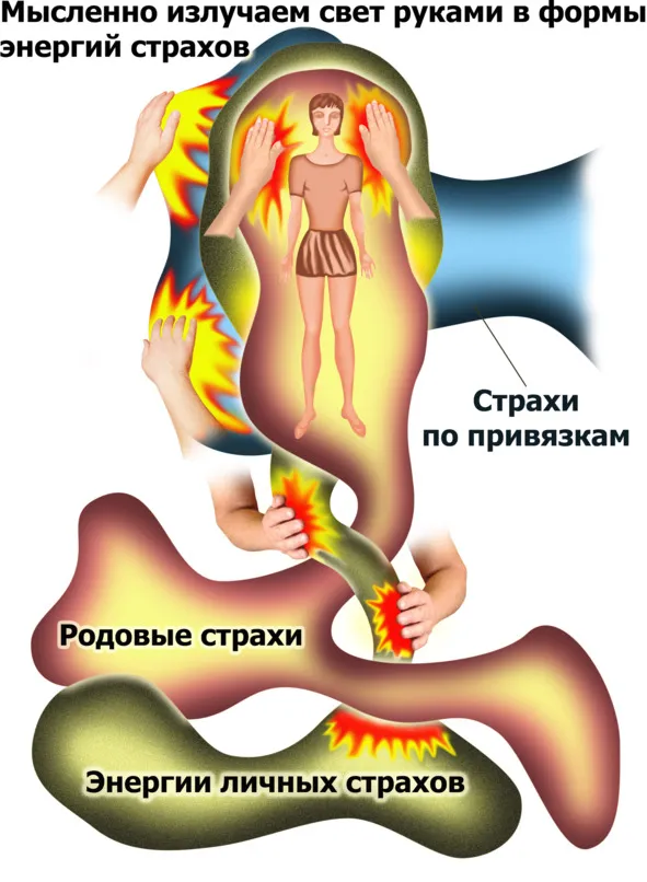 После этого выдумываем на человеке, или его образе, любую форму, похожую на изображение этих энергий на рисунке. Так как любая энергетическая работа часто бывает по времени затяжной, мы можем работать и сидя. В этом случае мы мысленно располагаем выбранную форму энергии перед собой так, чтобы было удобно дотянуться до неё руками с целью приложить свои ладони к удобному для вас участку. После этого реально прикладываем ладони к выбранному участку выдуманной формы и начинаем через них мысленно излучать в эту форму яркий свет любой цветности. Так же мысленно представляем, как этот свет постепенно заполняет всю эту форму. После того, как свет её заполнит, мы поддерживаем эту картинку около трёх минут, можно и более, после чего переходим к следующей, выбранной вами энергии. Таким образом мы отрабатываем все вышеприведённые на рисунке виды страхов, после чего переходим к работе с депрессией.