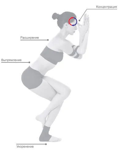 Не округляйте спину, не зажимайте сердечную область. Спина не должна скругляться, как бы низко вы ни сели. Активация Аджны и работа с ментальным планом при закрытом или угнетенном сердечном центре губительна для Пути практикующего. Позвоночник остается ровным и вытягивается к макушке. Для некоторых дыхание в этой асане естественным образом может быть немного поверхностное. Не старайтесь дышать животом и полной грудью, дыхание естественное и физиологично положению тела.