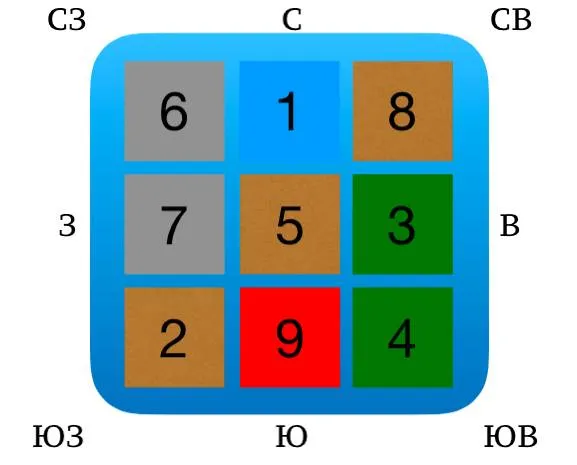 Для этого расположите в ВОСТОЧНОМ секторе предметы красного и цвета.