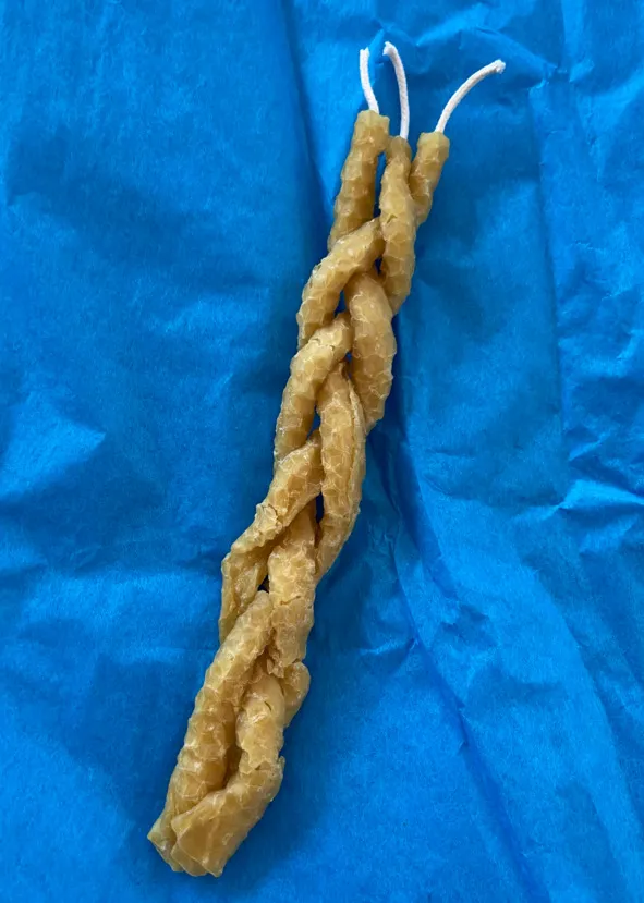 – Слепите и сплетите получившиеся свечи вместе, чтобы получилась одна свеча с тремя ветвями.