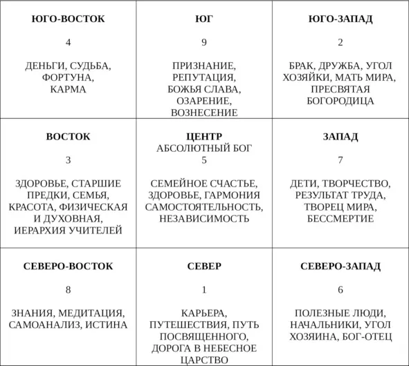 Из школы компаса известно, что каждый человек имеет свои лучшие и худшие направления. По общему багуа каждое направление за что-то отвечает (например, север – за карьеру, юго-запад – за брак и т. д.). Проводя исследования, я пришла к выводу, что причина жизненной неудачи человека, а именно – выполнение миссии Творца, – кроется в том, что человек эксплуатирует свои не лучшие направления в жизни. Мы будем пользоваться двумя понятиями: понятием багуа и понятием удачных и неудачных направлений в фэншуй, а потом для каждого человека будет расписана индивидуальная цепочка удачи.