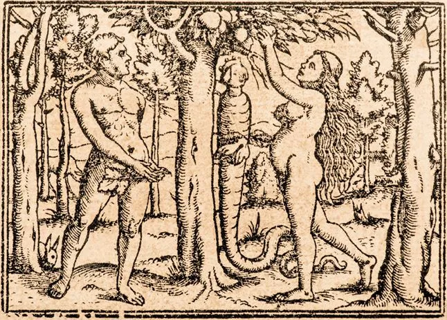 Адам и Ева в Райском саду вместе со змеем. Гравюра