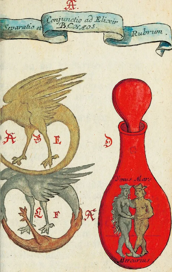 Страница с двойным Уроборосом из «Алхимического компендиума» Иоганна Михаэля Фауста. 1706