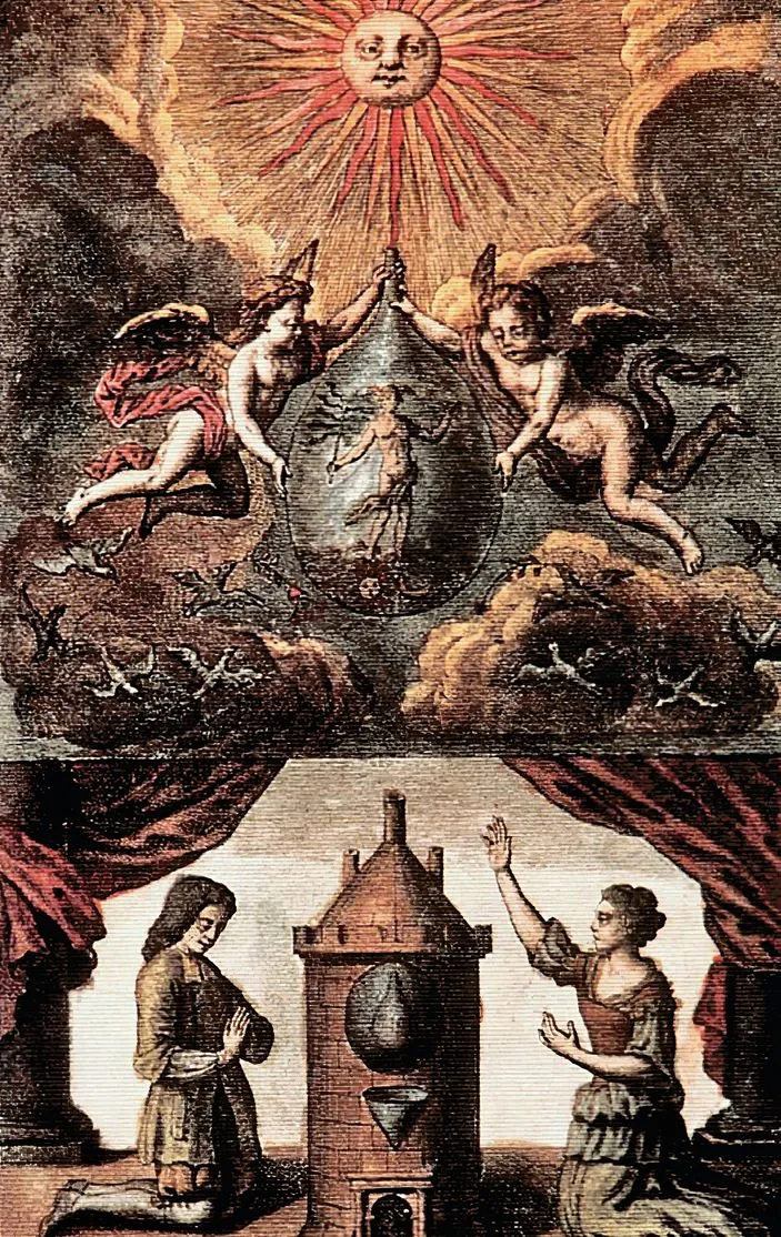 На второй гравюре мы видим следующее: алхимик стоит на коленях перед атанором4 вместе с soror mystyca, «мистической сестрой», необходимой – согласно некоторым источникам – для алхимического превращения. Находясь по разные стороны печи, они молятся. Над ними два ангела держат стеклянный сосуд, в котором заключены Нептун, Солнце и Луна. Сцена освещена присутствием Бога-Солнца, который раздвигает облака. Вероятно, на этой гравюре изображено начало алхимического процесса, которое передано молитвой, идущей снизу вверх.