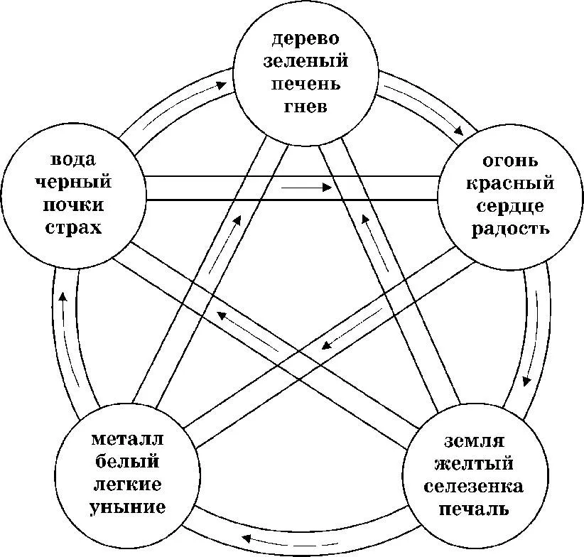 Элементы влияют друг на друга, создавая и разрушая друг друга. Циклы развития, разрушения элементов и их соответствие цветам, органам тела и эмоциям, приведены ниже.