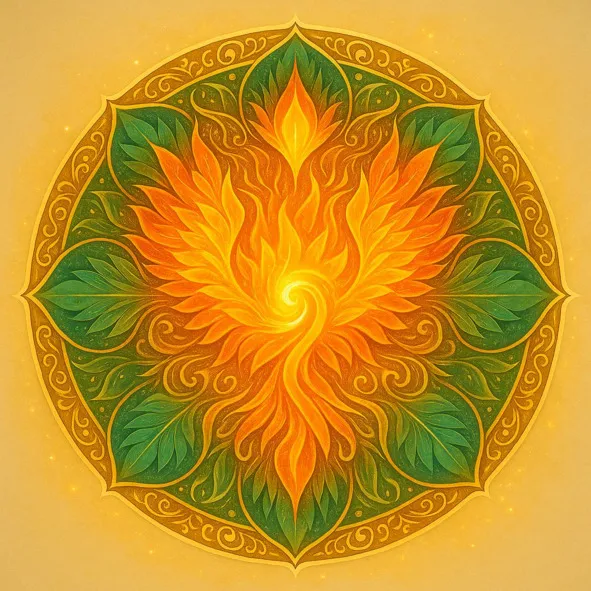 Мандала из языков света и перьев, складывающихся в форму огненного солнца. Внутри – пульсирующее ядро золотого света. Огонь не разрушает, а лечит. Атмосфера – обновление через священный огонь Феникса.