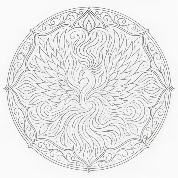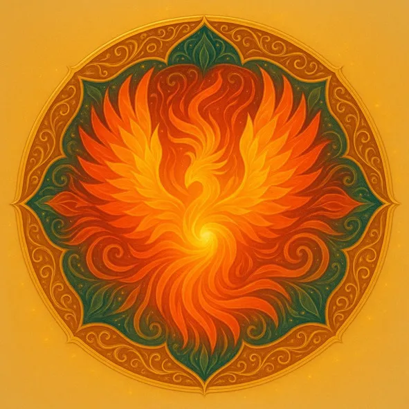 Два крыла Феникса, образующих круг – внутри сияет свет, словно солнечное сердце. Вокруг – орнамент из золотых и зелёных перьев. Символ – возвращение силы, равновесие, покой.