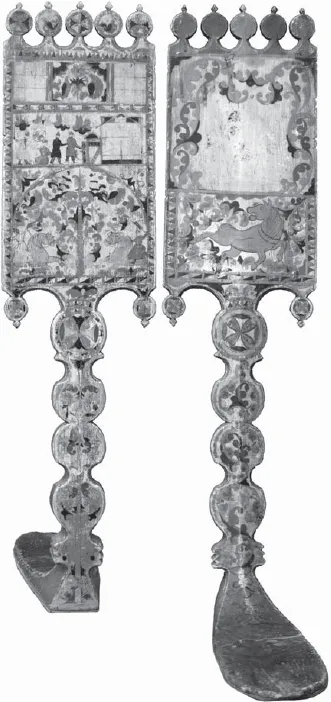 2. Прялка с нетрадиционным сюжетом. Мастер Степан Амосов. Начало 1880-х годов. Фрагмент. Лицевая сторона лопаски. Музей фресок Дионисия (5109)