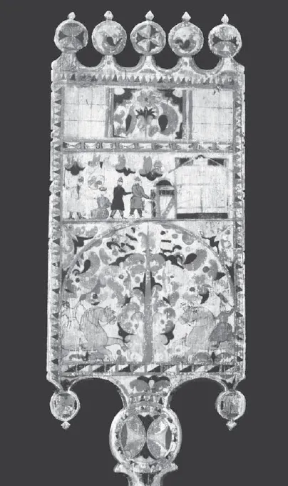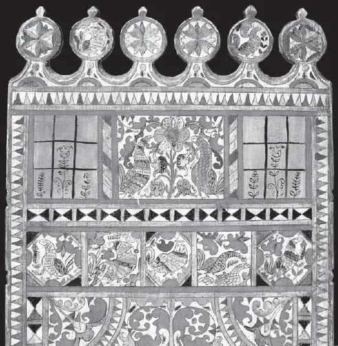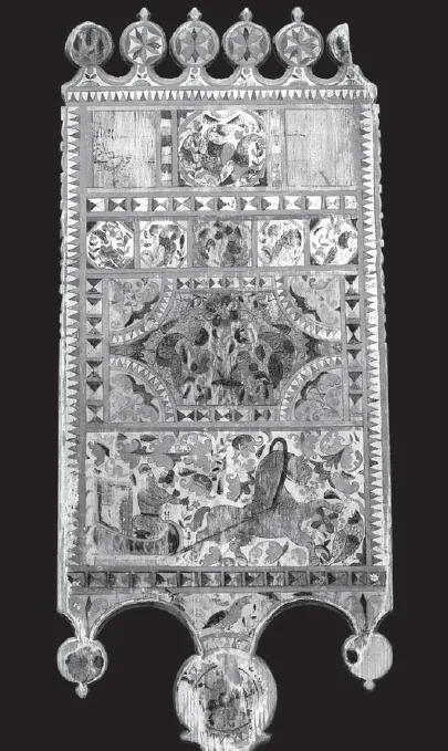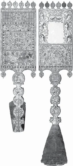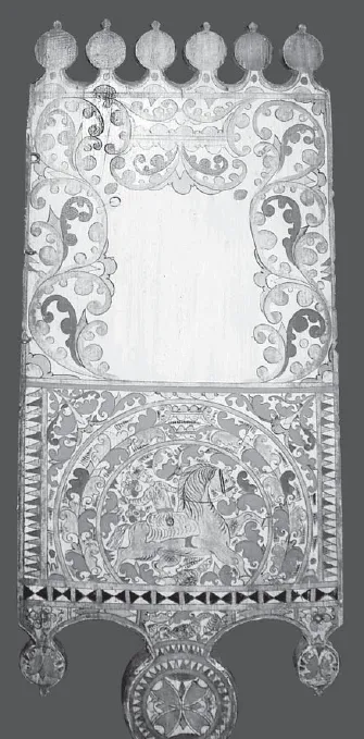 5. Подписная прялка Ильиных. Мастер Степан Амосов. 1882. Фрагмент. Верхние два яруса лицевой стороны лопаски. Собрание Ольги и Александра Ильиных (Ярославль)