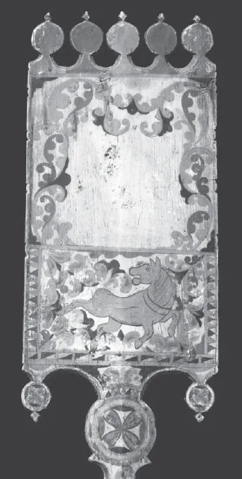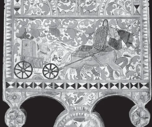 6. Подписная прялка Ильиных. Мастер Степан Амосов. 1882. Фрагмент. Сцена «выезда» на лицевой стороны лопаски. Собрание Ольги и Александра Ильиных (Ярославль)