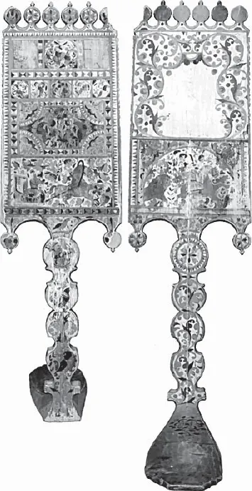 3. Прялка с нетрадиционным сюжетом. Мастер Степан Амосов. Начало 1880-х годов. Фрагмент. Оборотная сторона лопаски. Музей фресок Дионисия (5109)