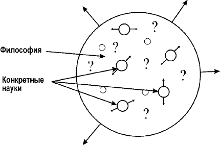 Стрелки на приводимой ниже схеме (1) как раз и показывают направленность такого постоянного расширения, как конкретно-научного знания (за счет накопления теоретических результатов и эмпирических данных), так и философского (за счет появления все новых вопросов).