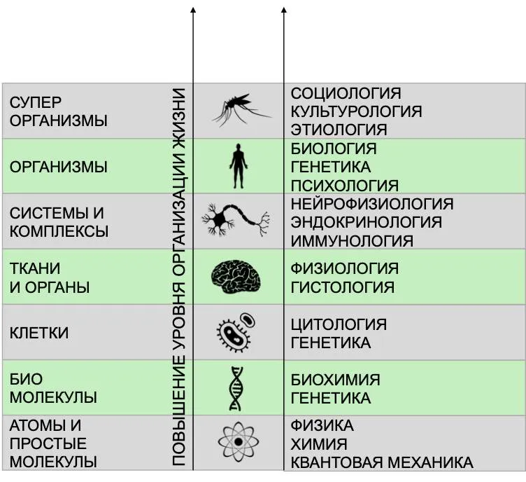Перечисленные уровни организации живой материи и соответствующие им комплексы наук можно кратко обрисовать при помощи схемы, показанной на следующем рисунке.