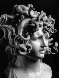 Голова медузы. Патологическая венозная сеть на брюшной стенке, которая встречается у больных с портальной гипертензией, носит название «голова медузы». Основной причиной ее появления является цирроз печени, при котором происходит реканализация пупочных вен. «Голова медузы» представляет собой клубок расширенных брюшных вен, которые расходятся в радиальном направлении от пупка, напоминая змеиное гнездо. Некоторые из этих вен дренируются краниально во внутреннюю вену молочной железы, а некоторые – каудально, в нижнюю вену молочной железы. Свое название эта венозная сеть получила из-за сходства со знаменитой головой Медузы, которая, по греческой мифологии, являлась одной из трех сестер горгон и имела довольно зловещую репутацию. На ее голове вместо волос росли змеи, а лицо было настолько ужасным, что каждый, кто смотрел на нее, превращался в камень. В конечном итоге Персею удалось убить горгону, глядя на ее отражение в отполированном щите. Щит был подарен ему богиней мудрости Афиной. После убийства Медузы Персей прикрепил ее голову на свой щит и использовал как «биологическое» оружие, превращая своих врагов в камень. Его примеру в дальнейшем последовали многие греческие пехотинцы, которые традиционно рисовали на щитах голову горгоны.