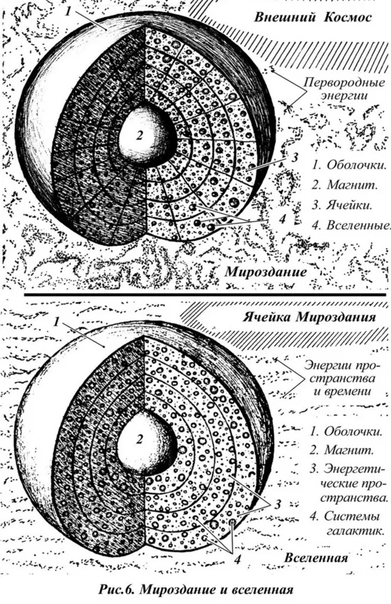 Мироздание – самая большая в космосе живая система, то есть защищенная от внешнего Космоса и пропускающая внутрь себя только энергии, необходимые для ее развития. При этом под развитием мироздания понимается развитие его энергетических систем и населяющих его существ.